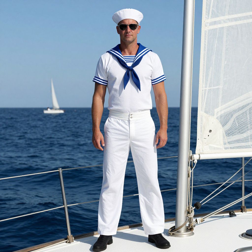 Sailing Costume, man in a sailor's outfit standing on a boat