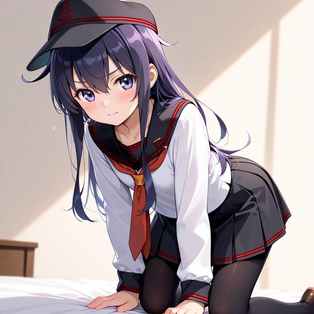 Akatsuki kai ni (kancolle), kantai collection, 1girl, purple eyes, hair between eyes, blue eyes, long hair, purple hair, black hair, serafuku, serafuku, flat cap, pleated skirt, black skirt, black pantyhose, long sleeves, anchor symbol, red neckerchief, by artist banned artist, illustrious