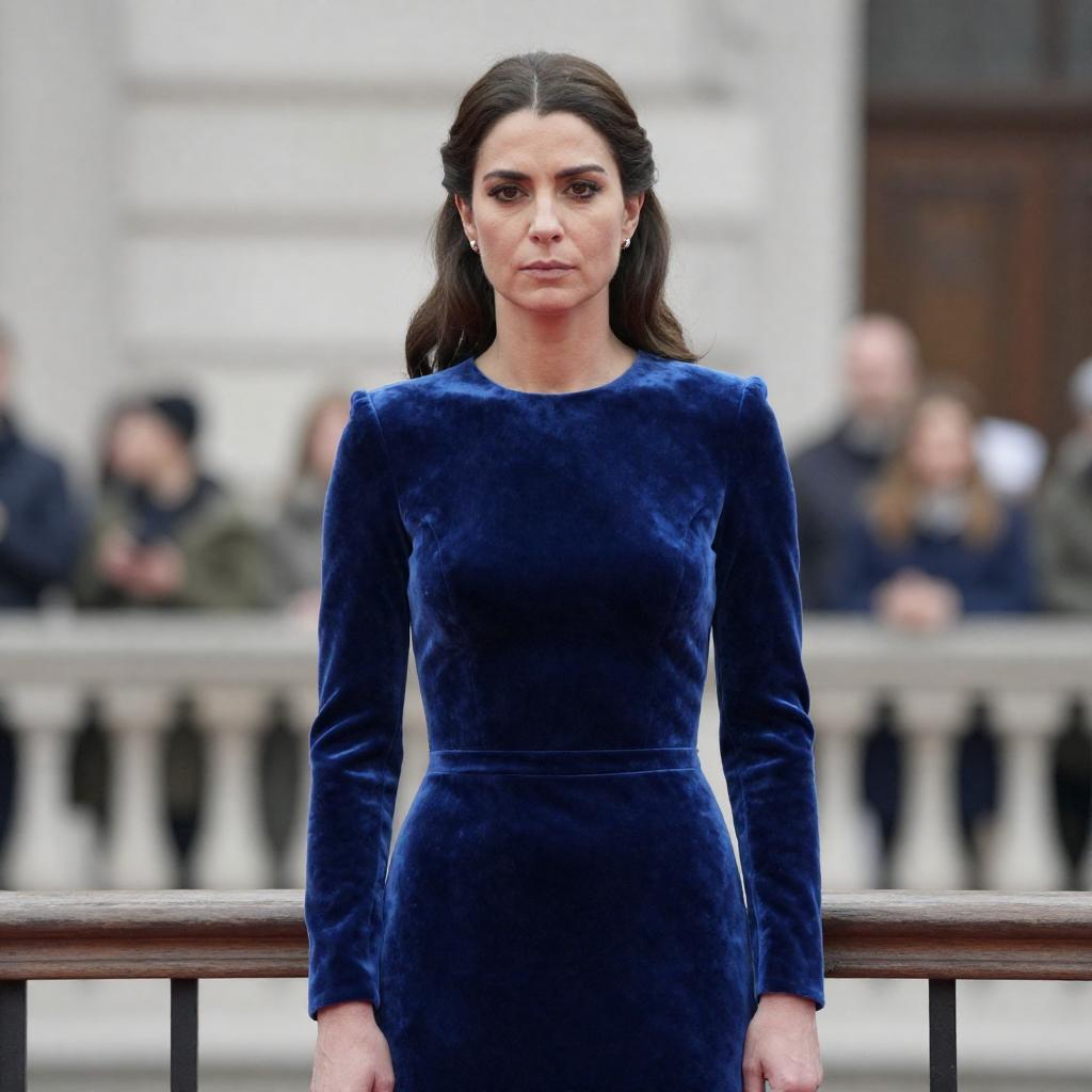 Photograph of a woman with dark brown hair in a blue, long-sleeved, velvet dress with a fitted bodice, standing in front of a wooden railing. She has a serious expression and is in an outdoor setting with a blurred background of people and a classical building.