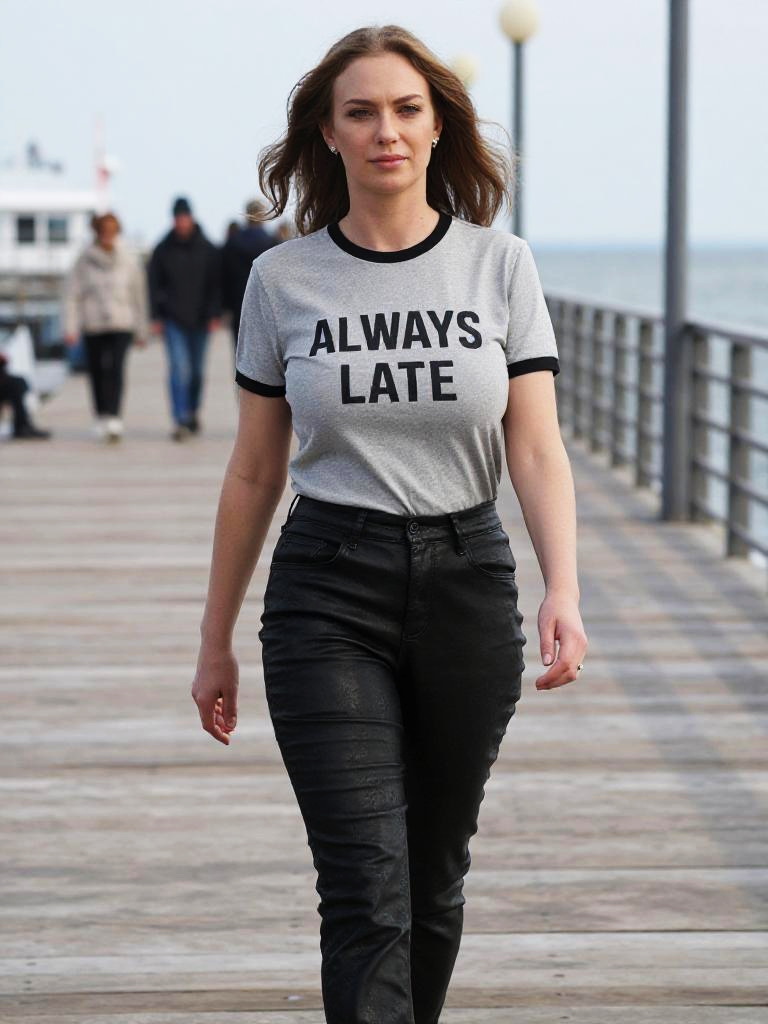 A woman in a Gottfried Helnwein style, casually chic in a grey short-sleeve T-shirt with black trim and always late slogan, paired with black faux leather pants, walking along a seaside boardwalk pier, hair flowing, natural makeup. Sexy. Pretty face and beаutiful eyes. Big breasts