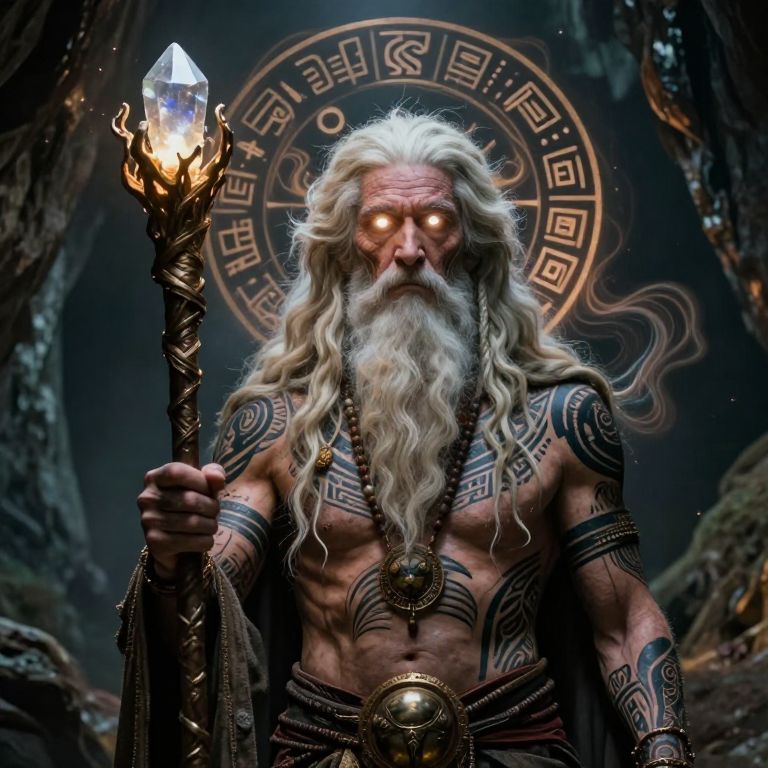 Muthology portrait of a wise old oracle with glowing eyes and intricate tribal tattoos, holding a staff topped with a crystal, surrounded by swirling energy and ancient sigils in a dark, mystical cave.