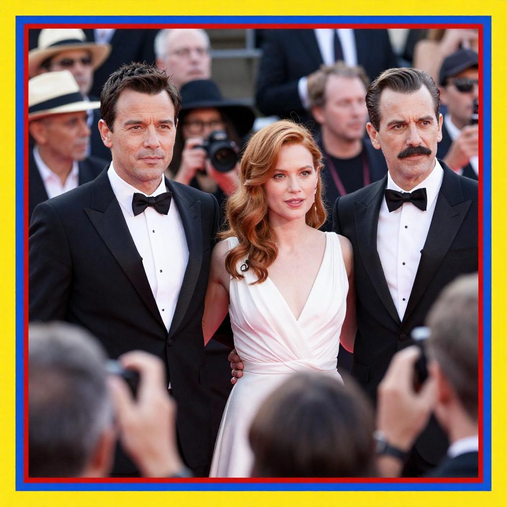 Photograph of a movie premiere. Three main people: a man in a black tuxedo with a bow tie, a woman in a white dress, and another man in a black tuxedo with a mustache. Crowd in background, many wearing hats. Yellow border with blue and red accents. People in foreground taking pictures. Woman has red hair, men have dark hair. Intense expressions on faces of people in tuxedos.