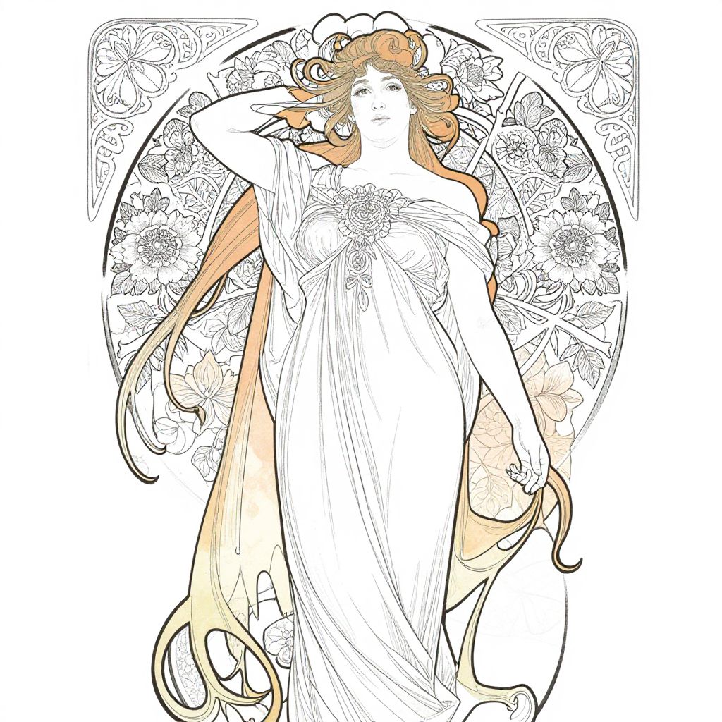 Alphonse Mucha coloring pages featuring intricate Art Nouveau floral designs, elegant women with flowing hair and draped garments, detailed ornamental borders and soft pastel shades, perfect for creative and relaxing coloring sessions.