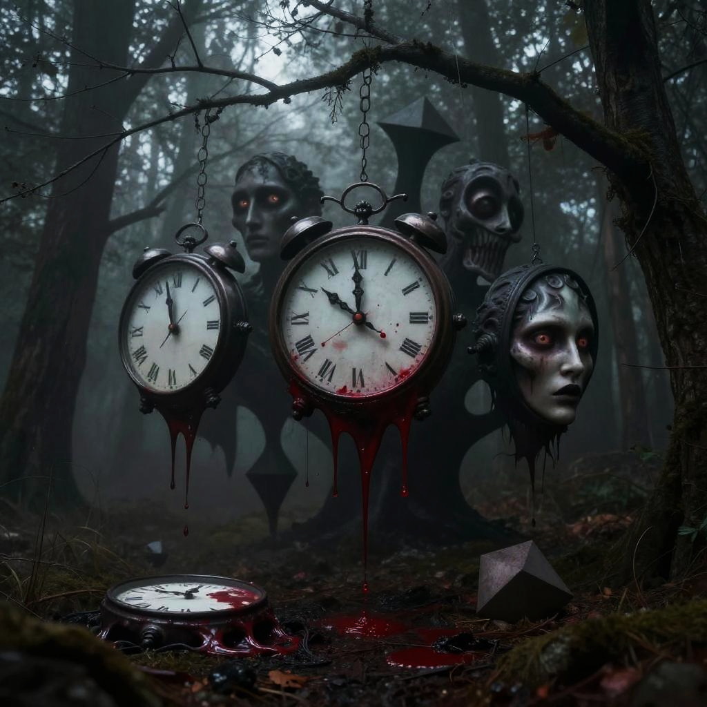 Photograph: Dark, eerie forest with three ghostly, clock-headed figures with blood-stained faces, hanging clocks, and dripping blood, set against
