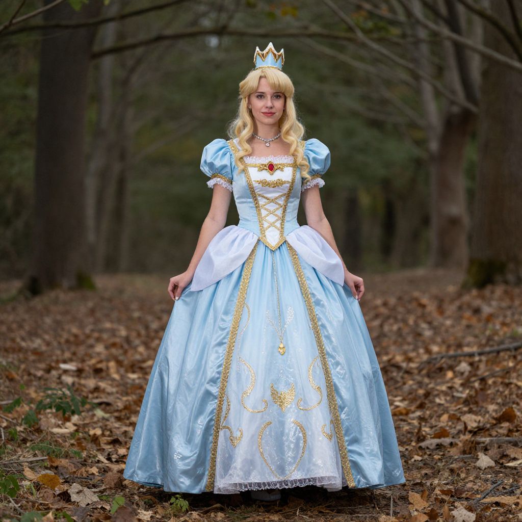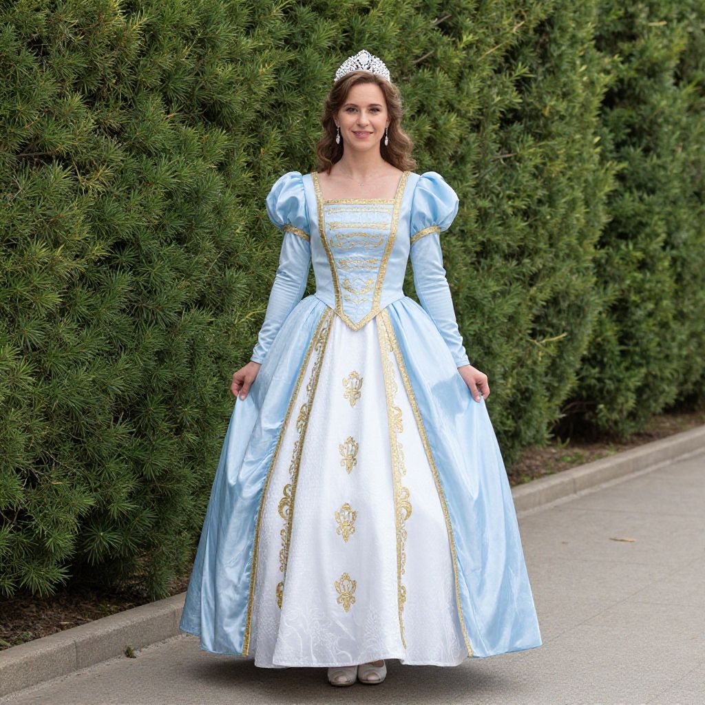 Full-body portrait of a woman dressed in a detailed blue and white Disney princess cosplay gown with puffed sleeves, gold trim, and embroidered patterns. She wears a tiara and earrings, standing outdoors on a paved path surrounded by lush green bushes and trees.
