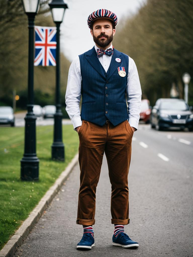 Funny british icons costume, male focus, union jack, facial hair, hat, 1boy, outdoors, pants, blurry, brown pants, socks, blurry background, jacket, hands in pockets, shoes, full body, lamppost, flag print, shirt, vest, mustache, american flag, beard, solo focus, white shirt, street, striped socks, standing, suit, formal, sneakers, road