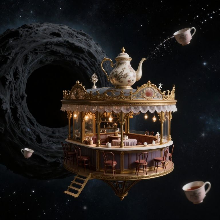 Anchored to the edge of a rogue black hole, a Victorian teahouse drifts silently through the cosmos, pouring tea into cups that orbit unseen.