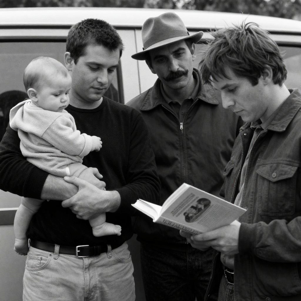 Black and white photograph featuring three men and a baby outdoors. The first man, wearing a dark long-sleeve shirt and light pants, holds a baby dressed in light-colored clothing. The second man, sporting a mustache and a fedora hat, wears a dark zip-up jacket and gazes forward. The third man, with tousled hair and a casual jacket, is reading a book intently. A vehicle is visible in the background.