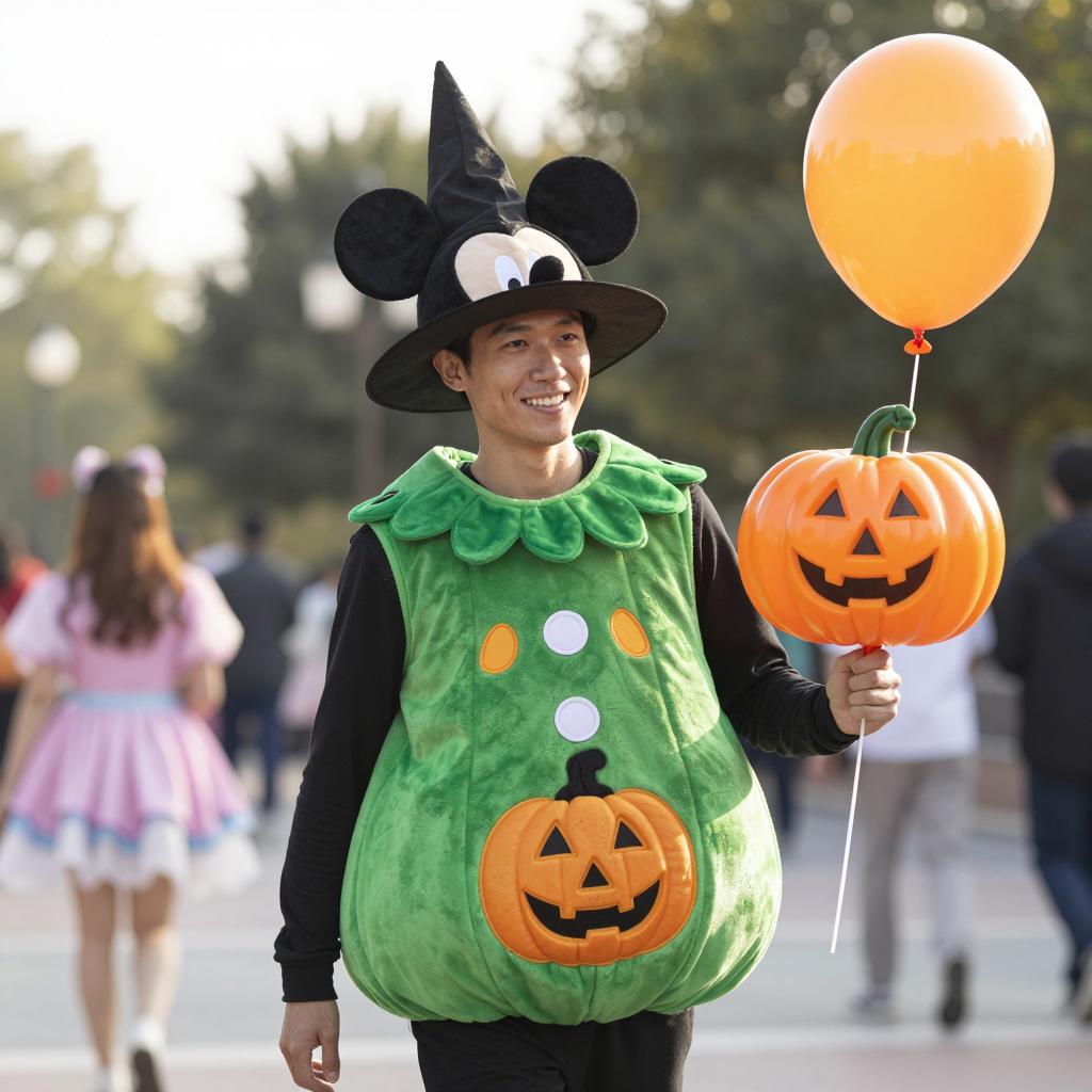Funny halloween costume, photograph of two men, one in front, one in background, Halloween costumes, front man wearing orange shirt, brown hat with feather, orange headband, checkered sleeves, black buttons, brown belt, smiling, background man wearing white skeleton mask with black paint, orange pumpkin headpiece, outdoors, sunny, blurred people in background, casual, festival atmosphere, daytime, bright colors