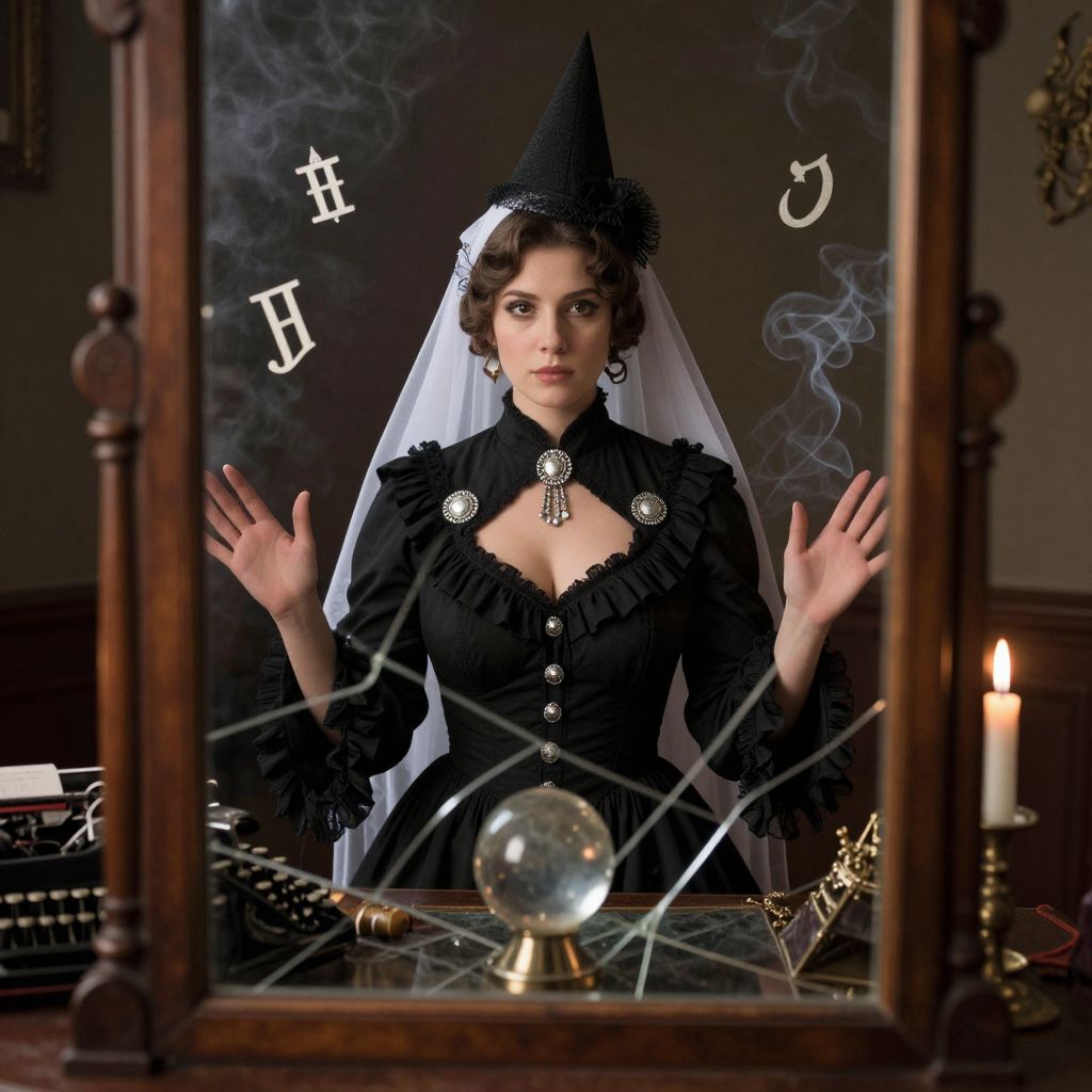 Photorealistic image of a woman in a 1930s spiritual medium costume — long black dress with frills, silver brooches, a pointed hat, and a white veil — seated behind a cracked mirror during a seance, her face serene yet otherworldly, surrounded by floating symbols and candle smoke, the room is dimly lit with antique furniture, a typewriter, and a crystal ball, fully capturing the mysterious seance aesthetic of the era.. The woman has big tits and cute face
