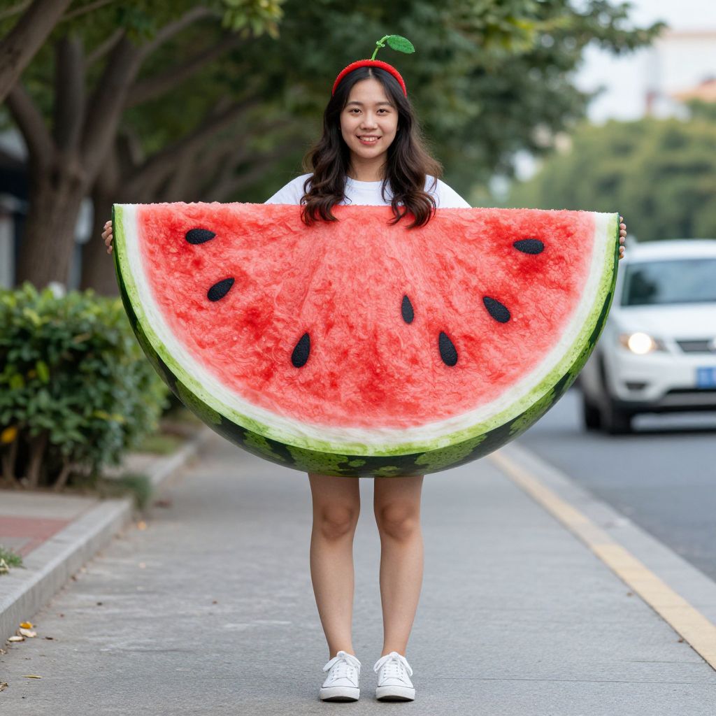Watermelon Slice Costume Adult, woman in a watermelon costume standing on a sidewalk