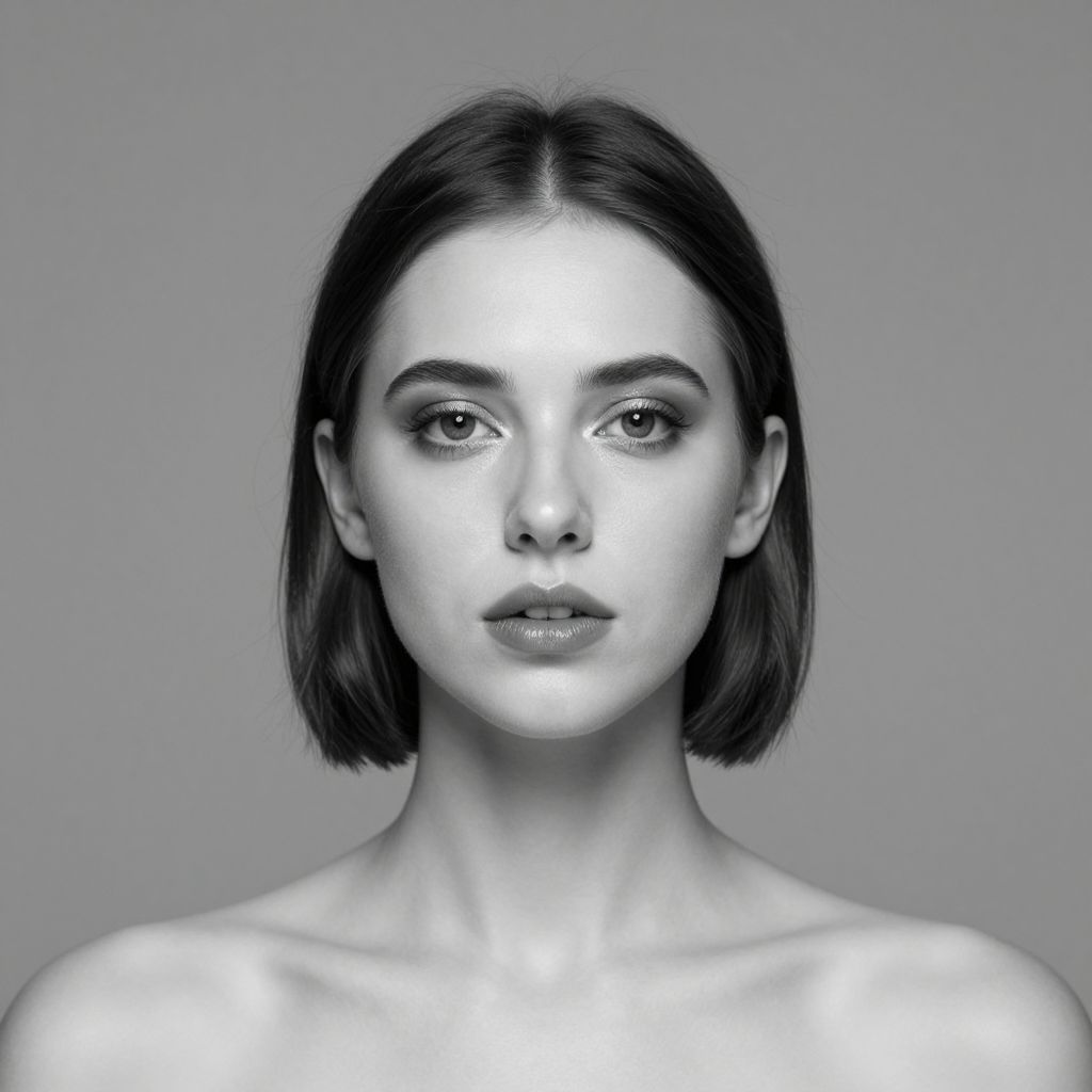 This is a high-contrast, black-and-white photograph of a young woman with a flawless, fair complexion, facing the camera directly. She has straight, shoulder-length dark hair parted in the middle, framing her symmetrical face. Her eyes are almond-shaped with well-defined eyebrows, and her lips are slightly parted. She has a smooth, clear complexion with minimal makeup, emphasizing her natural beauty. The background is a solid, light gray, which highlights the subject's features. The lighting is soft, creating a subtle glow on her face and upper shoulders, which are bare. The overall style is modern and minimalist, focusing on the woman's serene and striking appearance.