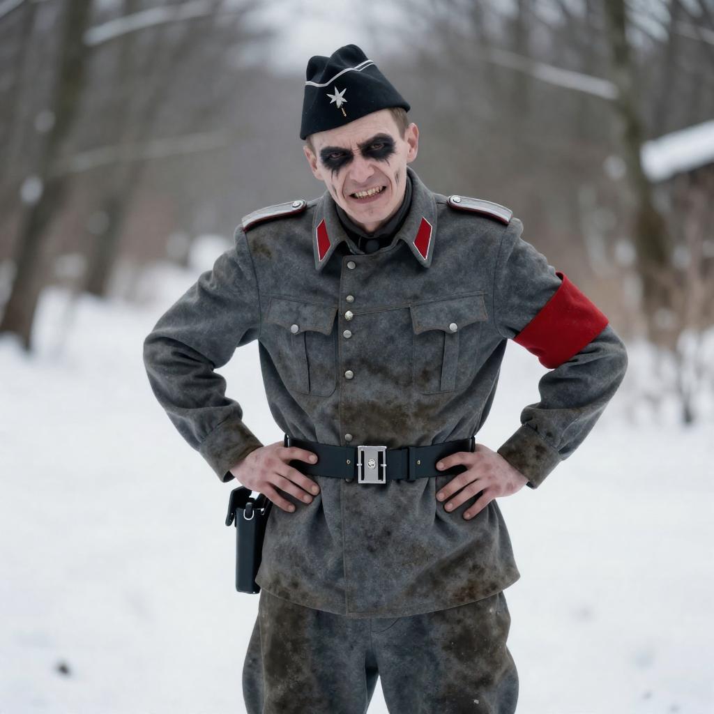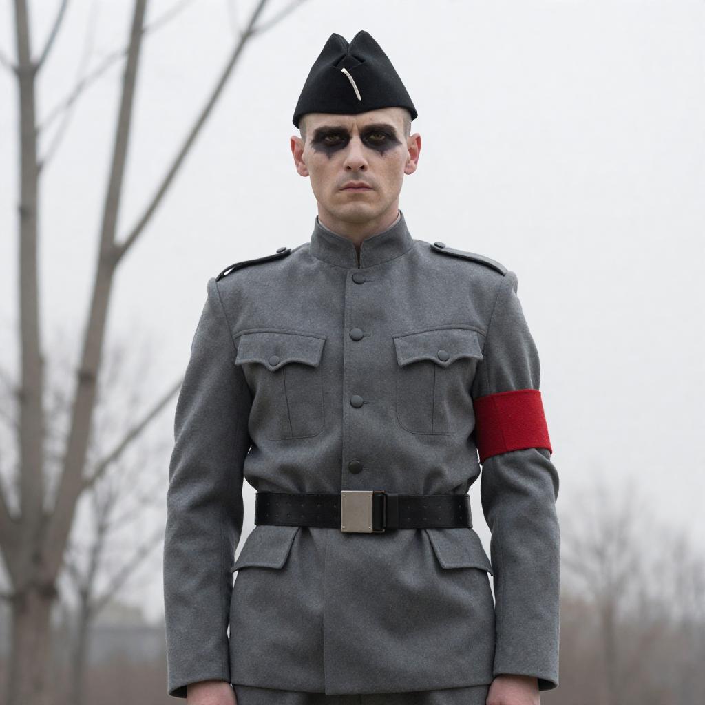 Photograph of a stern-looking male soldier in a gray, double-breasted military uniform with a black peaked cap and red armband. He stands against a white, overexposed background with leafless trees. His face is pale, with dark makeup around the eyes and mouth, giving a dramatic, intense appearance.