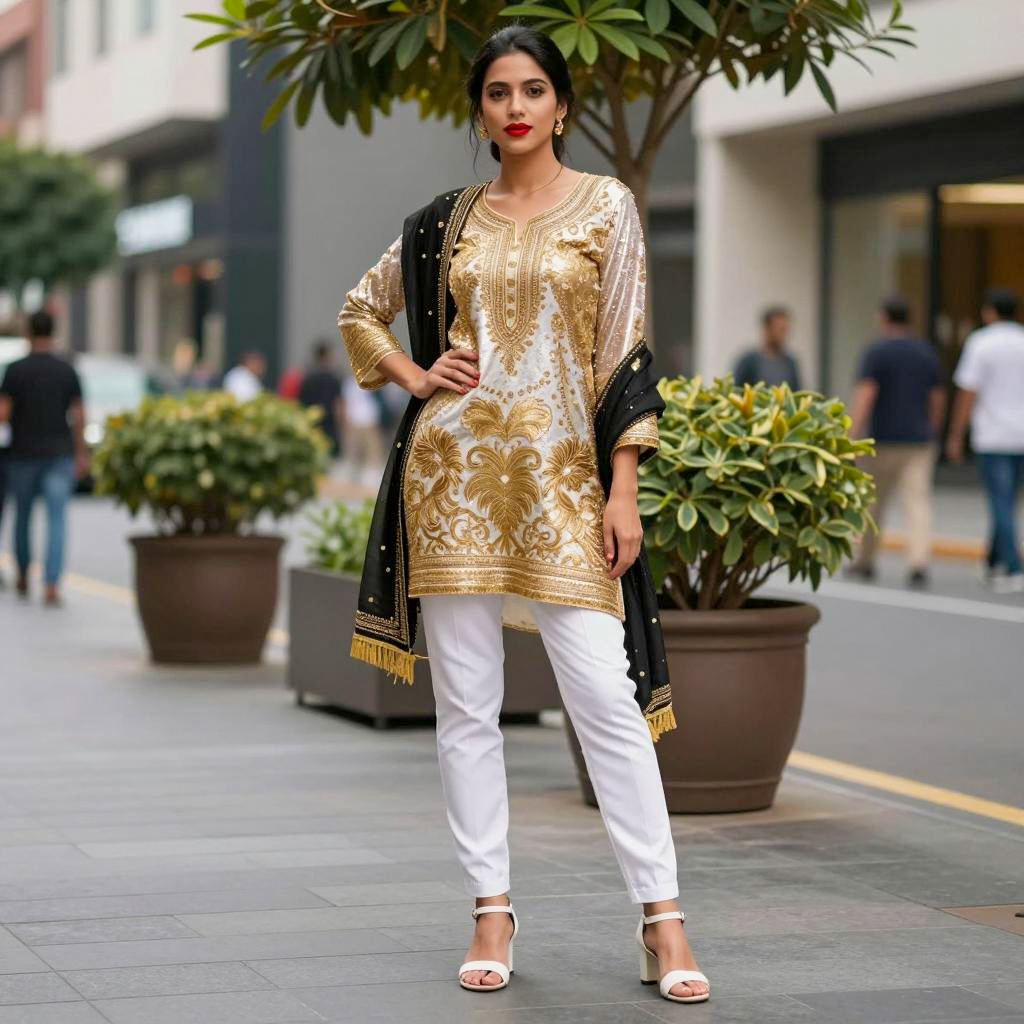 Gold sequin costume, photograph of a woman standing outdoors, daytime, urban setting, full body, ethnic fashion, gold and white ornate top, white pants, black shawl, white open-toe sandals, dark hair in bun, red lipstick, background with potted plants, blurred people in the background, tree with green leaves, street, modern architecture, fashionable, confident, casual pose, street fashion, colorful, detailed clothing, city environment