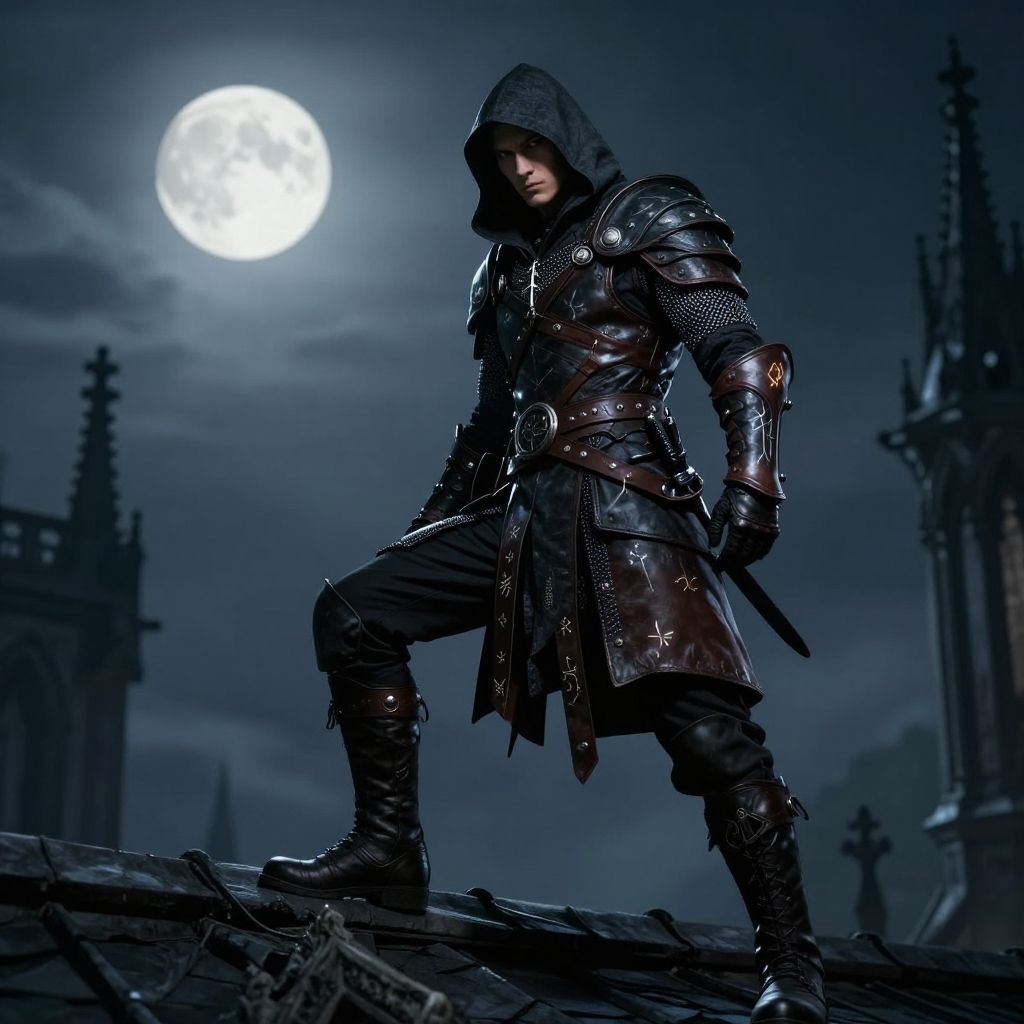 Male fantasy rogue armor crafted from layered leather and chainmail, dark muted colors with glowing runes, agile thief poised atop a gothic rooftop under moonlight