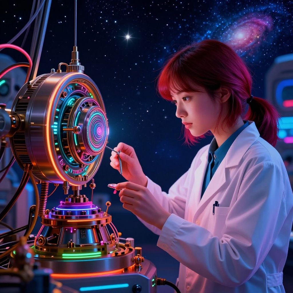 Photograph of an Asian woman with fair skin and red hair in a ponytail, wearing a white lab coat, intently working with a complex, multicolored robotic device illuminated by neon lights. The background is a starry, cosmic scene with galaxies and stars, adding a futuristic feel. The woman's focused expression and precise movements suggest she is calibrating or repairing the device. The robotic device features concentric rings of multicolored lights, cables, and mechanical components. The scene is brightly lit, emphasizing the vibrant colors and high-tech elements.