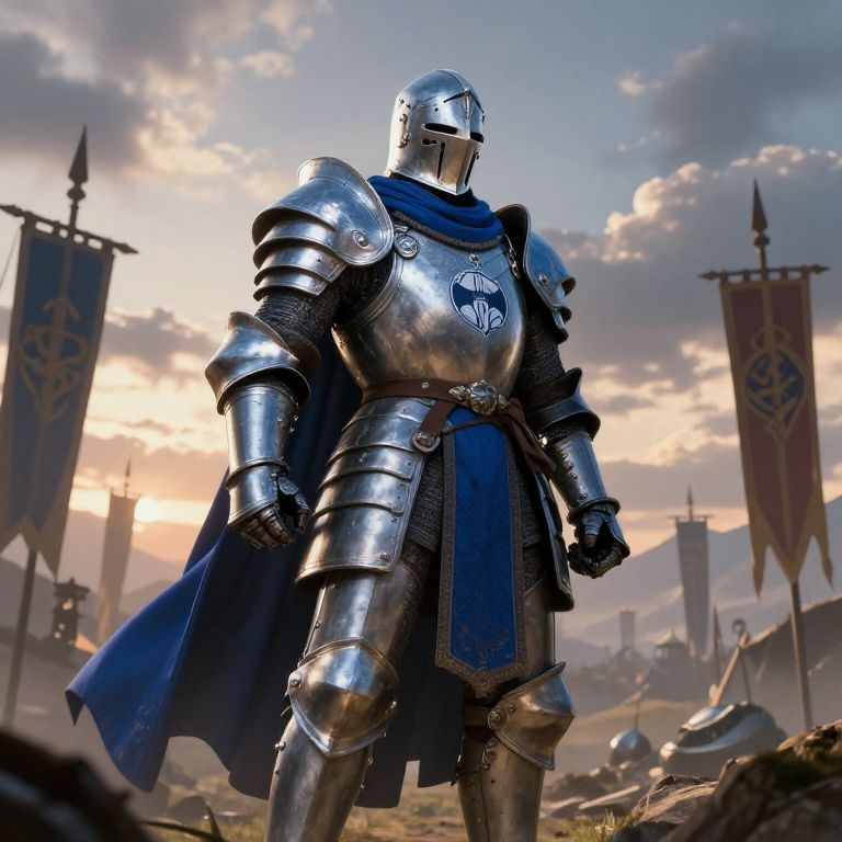 Photorealistic CGI of a armored knight in shiny silver armor and blue cloak, standing proudly in a sunset-lit medieval battlefield.