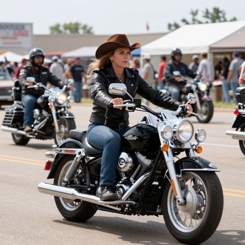 Woman rider confidently navigating her classic motorcycle through the bustling streets of Sturgis, South Dakota, during the annual Sturgis Motorcycle Rally, donning a stylish brown cowboy hat and black leather jacket, with the iconic rally atmosphere visible in the background.