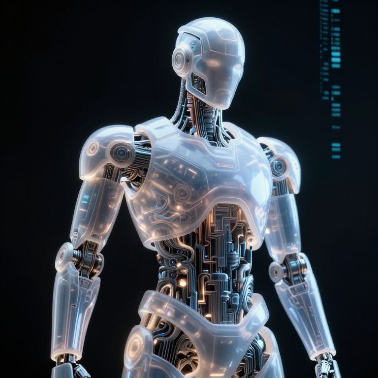 3d image ai visualizes an advanced robot sculpted from translucent materials, intricate inner circuits glowing softly, set against a dark background with floating digital data streams, hyper-realistic textures and dramatic lighting, sci-fi art style