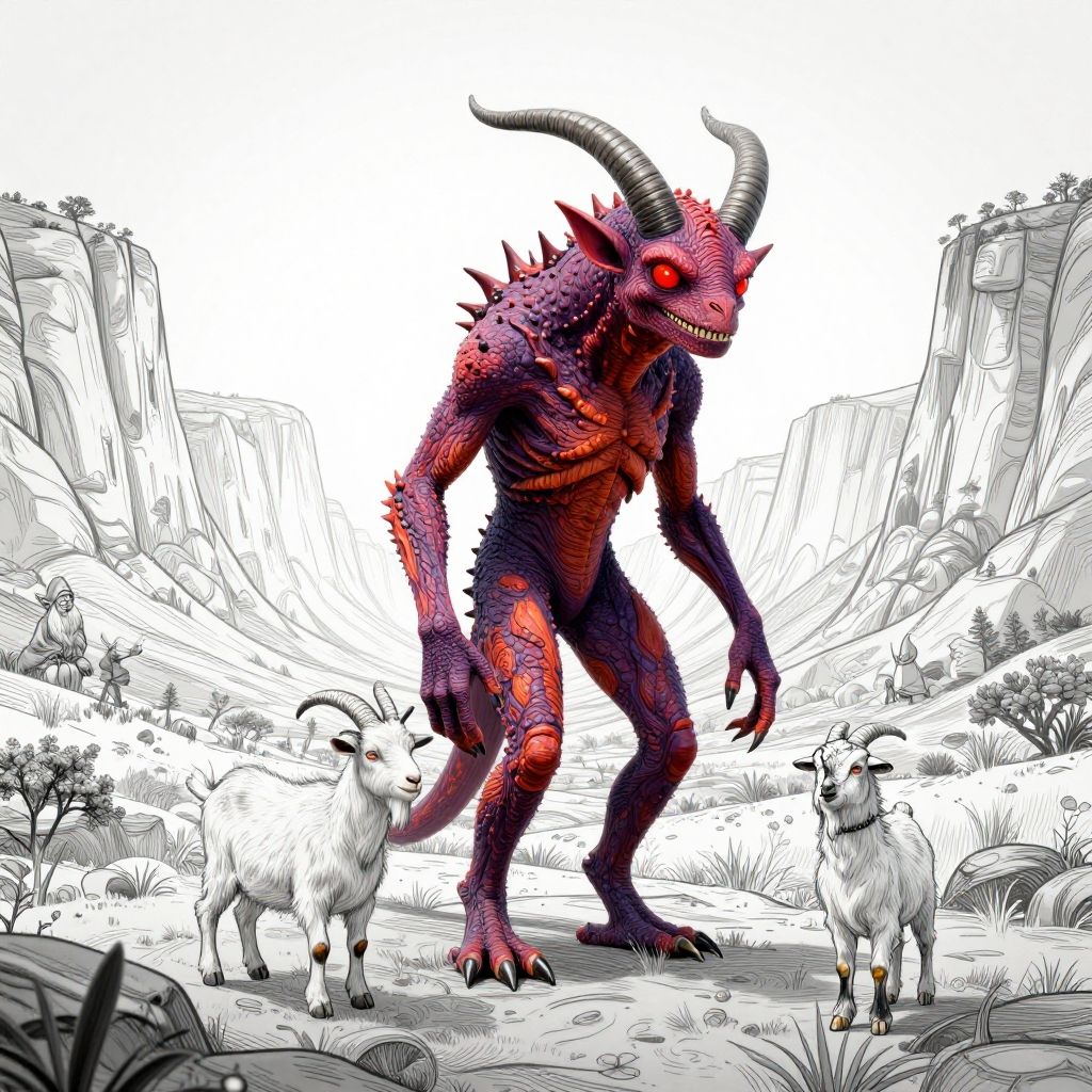 Chupacabra - Cryptid known for attacking livestock, especially goats, in Latin American folklore., Dwarves, Elf, SpiritHyperrealistic art imaginative vibrant gothic fantasy concept artlonesome Canyonideal weatherWillem van Aelst, Miles Aldridge, Marie Laurencinline art drawing . professional, sleek, modern, minimalist, graphic, line art