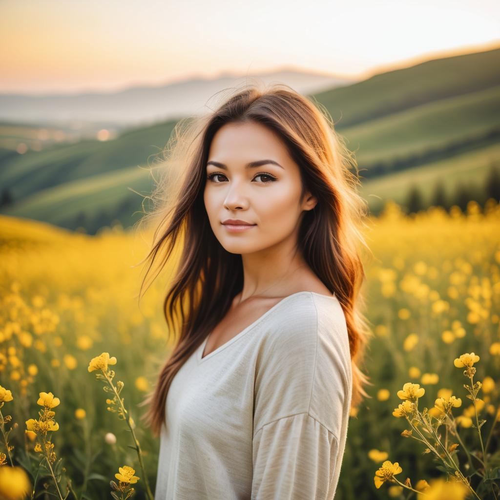 A young woman standing in a field of blooming yellow flowers under soft natural light during golden hour, warm tones, gentle focus on her face, serene and peaceful atmosphere, detailed background of lush greenery and distant hills