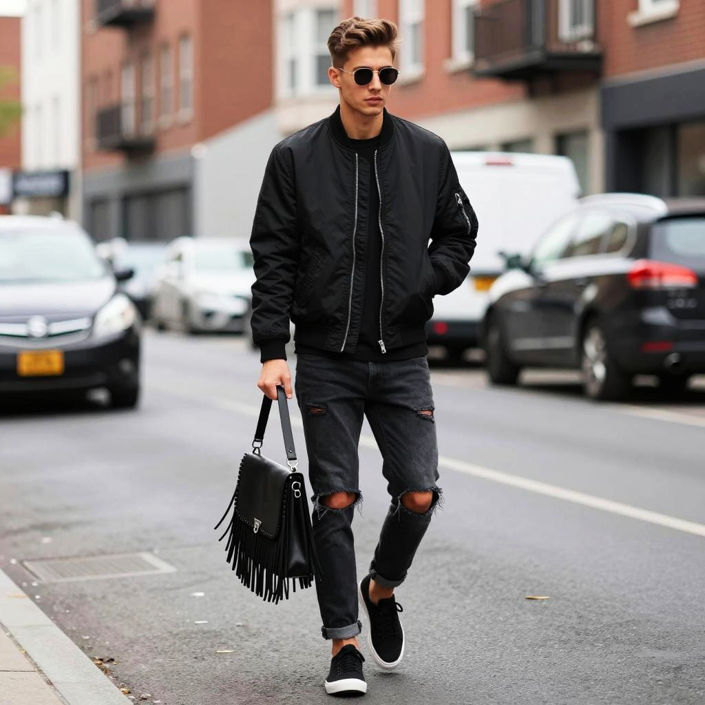 A young man walks confidently down an urban street wearing a stylish black bomber jacket and ripped black jeans, carrying a black fringed bag. The photo captures a modern streetwear look against a backdrop of brick buildings and parked vehicles, showcasing a casual yet trendy urban fashion style.