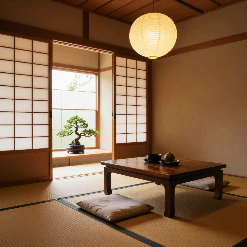 Japanese traditional living room with tatami mats, shoji sliding doors, low wooden table, minimalist decor, soft natural lighting, bonsai plant on the side, delicate paper lanterns hanging from ceiling, serene and peaceful atmosphere, warm earth tones