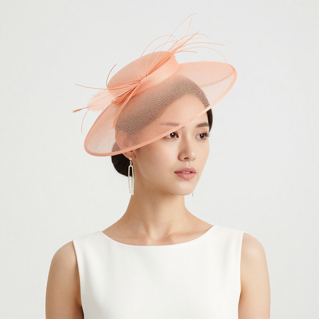 Elegant woman wearing a peach fascinator hat adorned with delicate feather-like details, complemented by a minimalist white dress and dangling earrings, set against a clean white background.