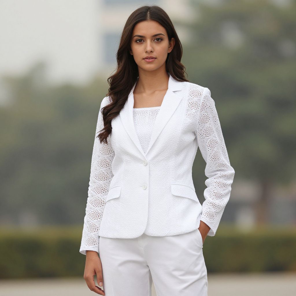 Photograph of a young woman with long, wavy dark brown hair and medium brown skin, standing outdoors. She wears a white, long-sleeved, lace-trimmed blazer over a white top, paired with white pants. Her expression is neutral, and she has her right hand in her pocket. The background is blurred, featuring green trees and a white building. The overall style is modern and elegant, with a focus on crisp, white clothing. The image has a bright, natural light, highlighting her confident and poised stance.