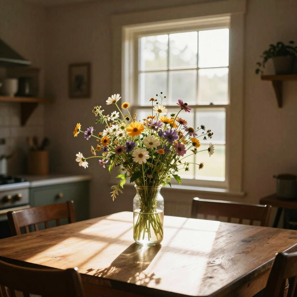 Kitchen table vase filled with fresh wildflowers, morning sunlight streaming through a rustic farmhouse window, warm tones and cozy atmosphere, soft shadows