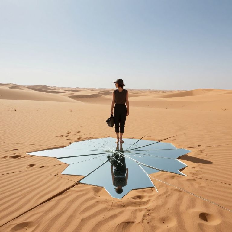 In the vast expanse of a sun-drenched desert, a solitary figure stands upon a cracked mirror, their reflection fragmented yet whole, symbolizing the duality of existence—where the harshness of reality meets the infinite possibilities of imagination, evoking a profound sense of introspection and the ephemeral dance between presence and absence.