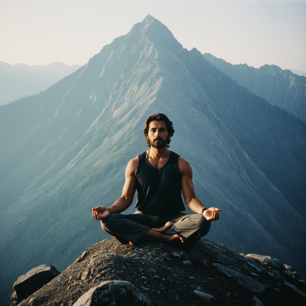 Fujifilm Pro 400H cinematic film still of meditative yogi in misty mountain peak with diffused early morning light.