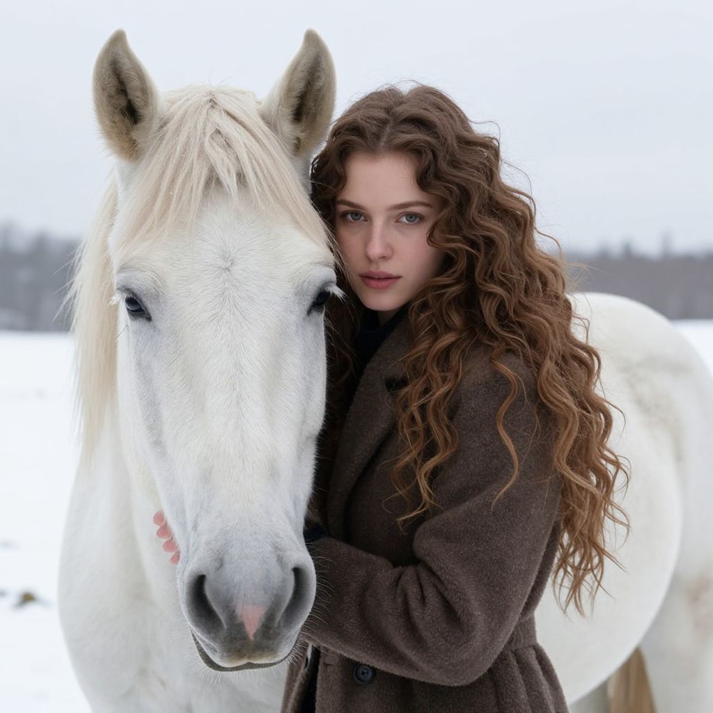 A young woman with long, brown, curly hair hugs a white horse in a snowy, high-quality photograph by Anton Corbijn.