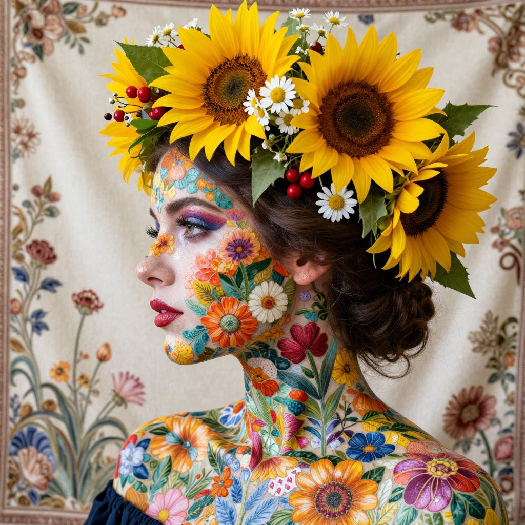 Photograph of a woman with dark brown hair in an updo, wearing a vibrant, sunflower-themed face and body paint. Her face, neck, and shoulders are covered in colorful flowers, including sunflowers, daisies, and red berries. She has bright red lipstick and blue eyeshadow. A large, sunflower-filled headpiece adorns her hair. The background features a floral-patterned, off-white fabric. The image has a vivid, almost surreal quality, emphasizing the bright colors and intricate floral designs. The woman's expression is serene, and she gazes to the left.