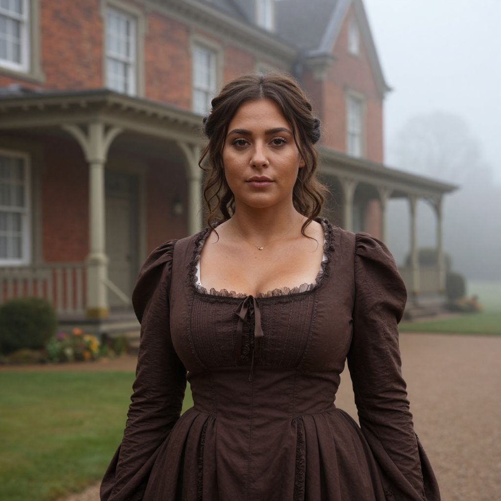 A woman with tanned skin and soft brown eyes wearing a brown full sleeve dress as a part of a Victorian-era costume, standing in an old-style English mansion with red bricks, a wooden porch, and a foggy morning atmosphere, the dress making her look regal and timeless.. The woman has big tits and cute face