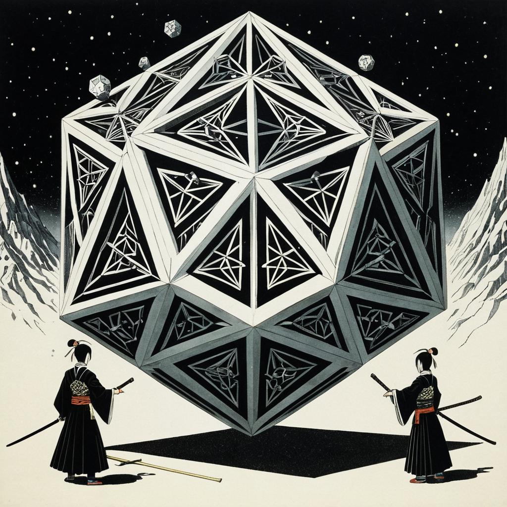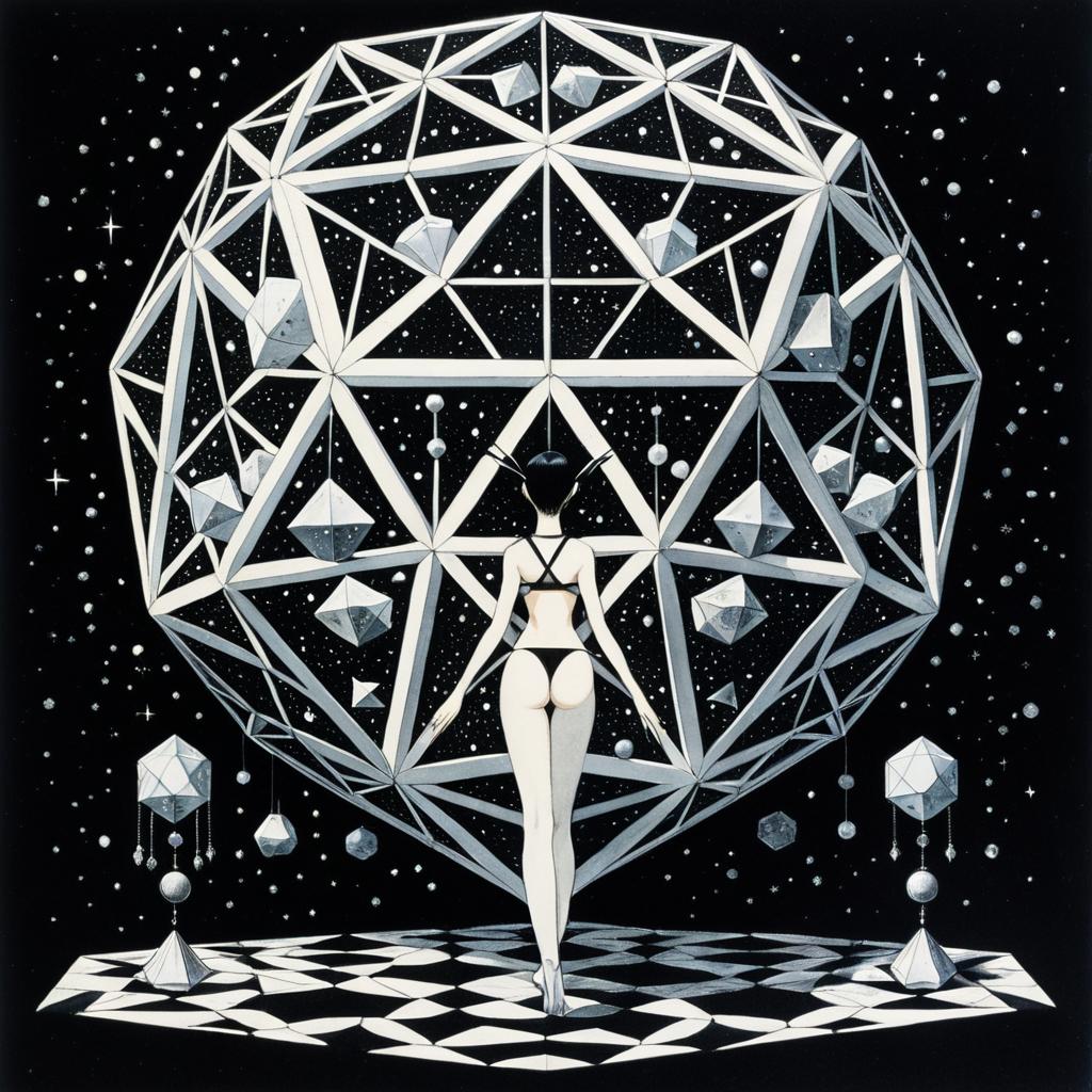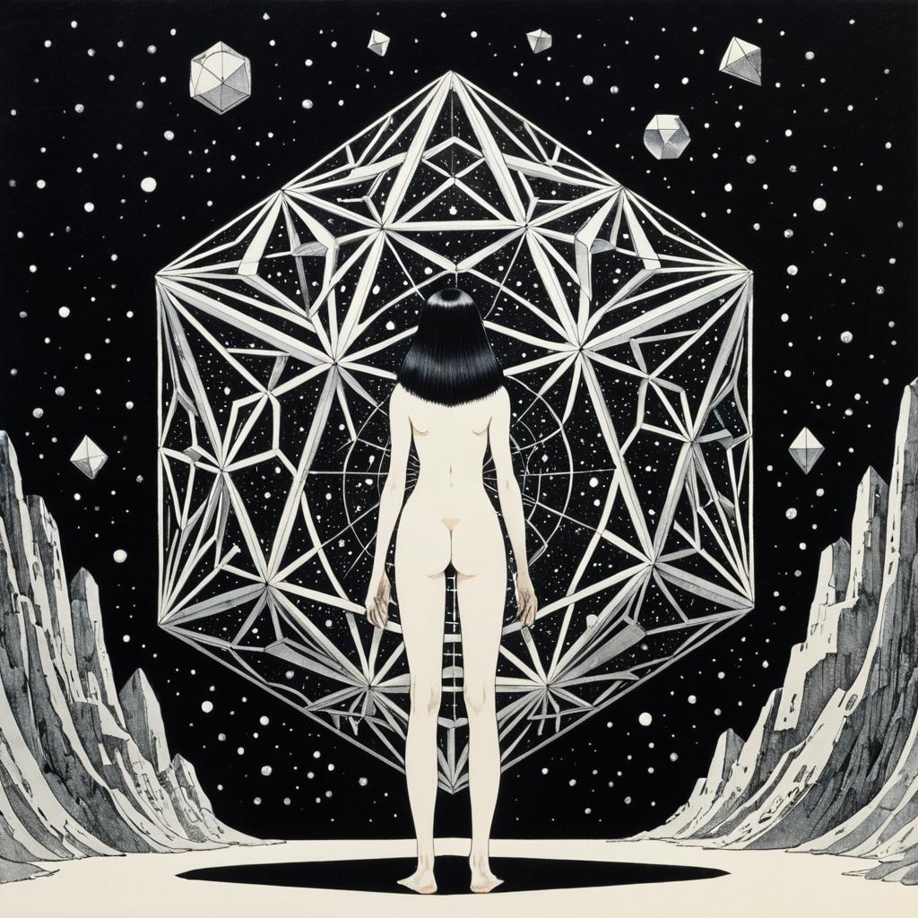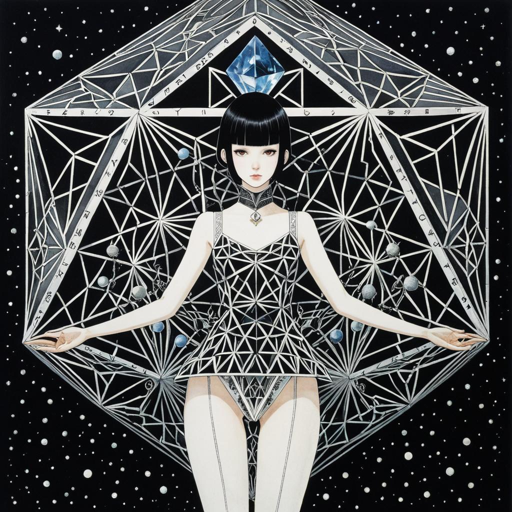 A surreal, sci-fi inspired illustration of a beautiful anime-style girl surrounded by intricate platonic solid geometric shapes. She has short black hair with blunt bangs, pale skin, and wears a detailed, futuristic bodysuit featuring a complex pattern of intersecting triangles. The background is a starry cosmos, emphasizing the fantasy and strange atmosphere. The artwork combines elements of fantasy, geometry, and Japanese anime aesthetics.