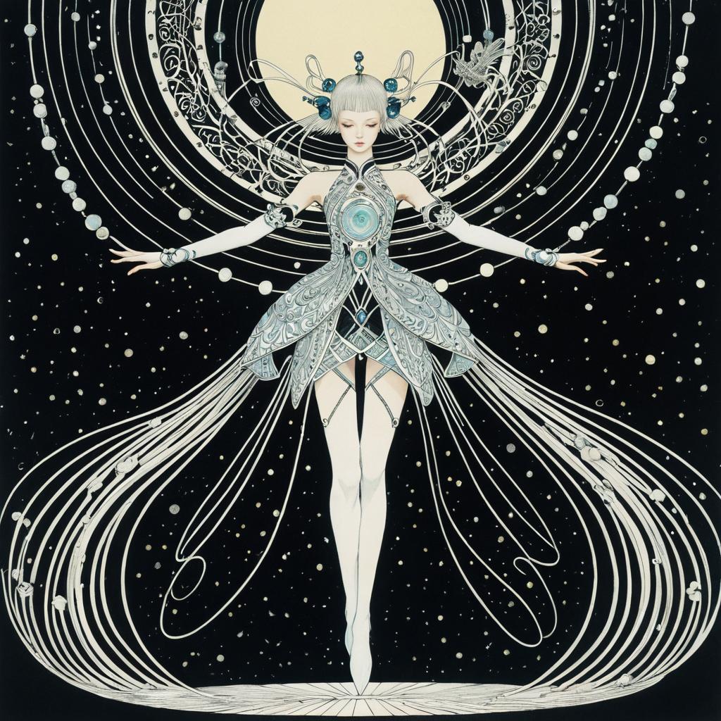 Kay Nielsen, Ayang Cempaka, Mysterious, strange, surreal, bizarre, fantasy, Sci-fi, Japanese anime, the other side of Platonic solids, visualization of pitch and melody, beautiful girl, perfect voluminous body, detailed masterpiece