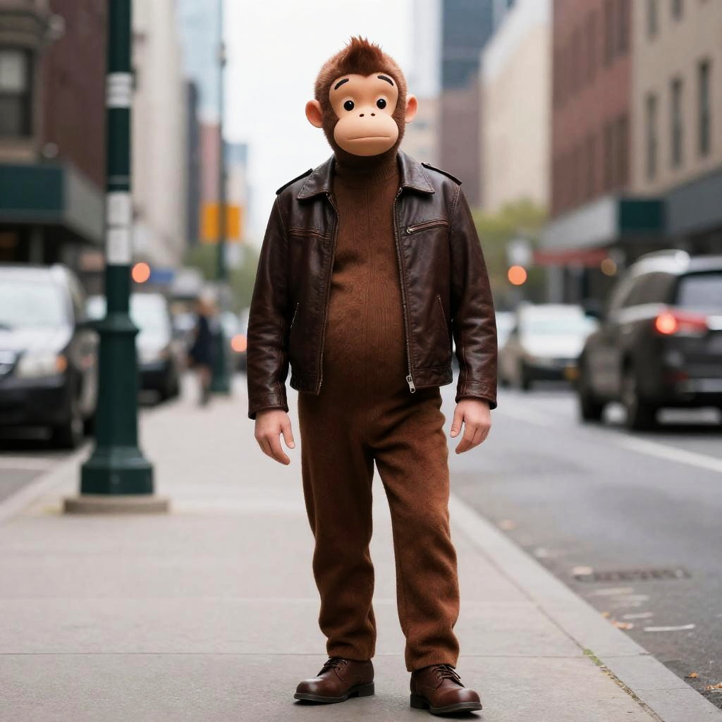 Curious George Costume Man, man in a leather jacket standing on a city street