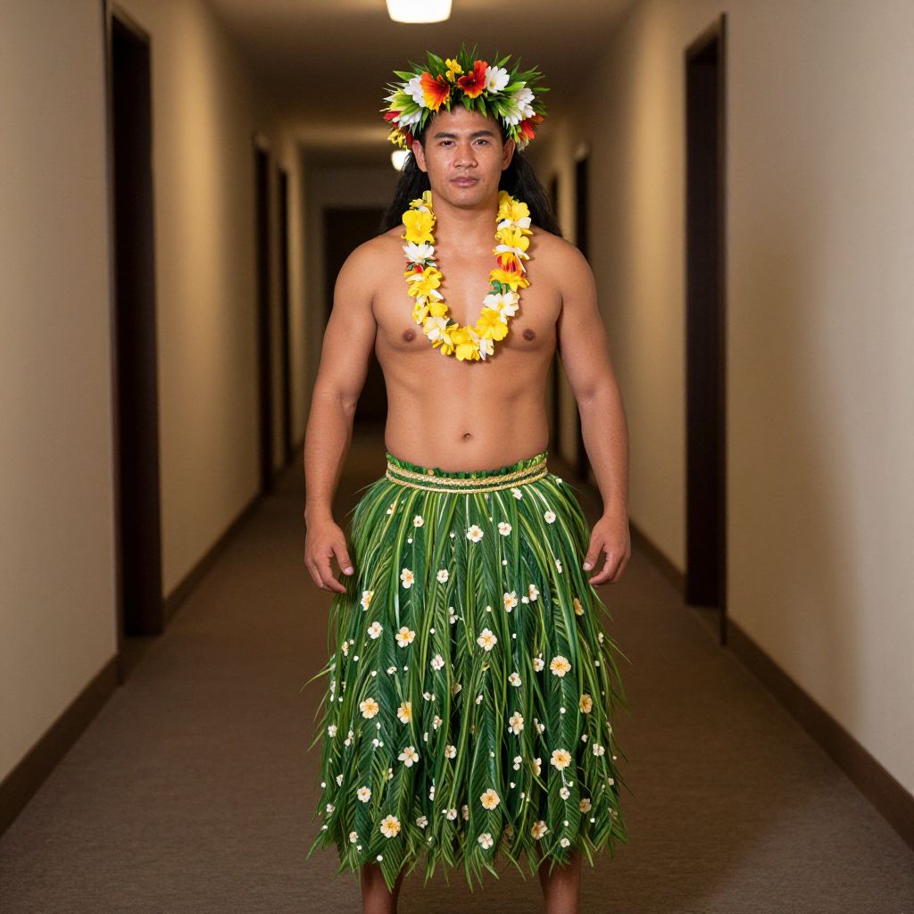 Hawaii National Costume Man, man in a hula skirt and flower crown standing in a hallway