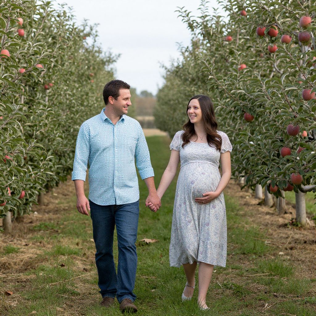 Expectant parents stroll hand-in-hand through a picturesque apple orchard, surrounded by rows of lush green trees bearing ripe red apples, as the woman gently cradles her growing belly in a floral maternity dress while the man wears a crisp checkered shirt and jeans.