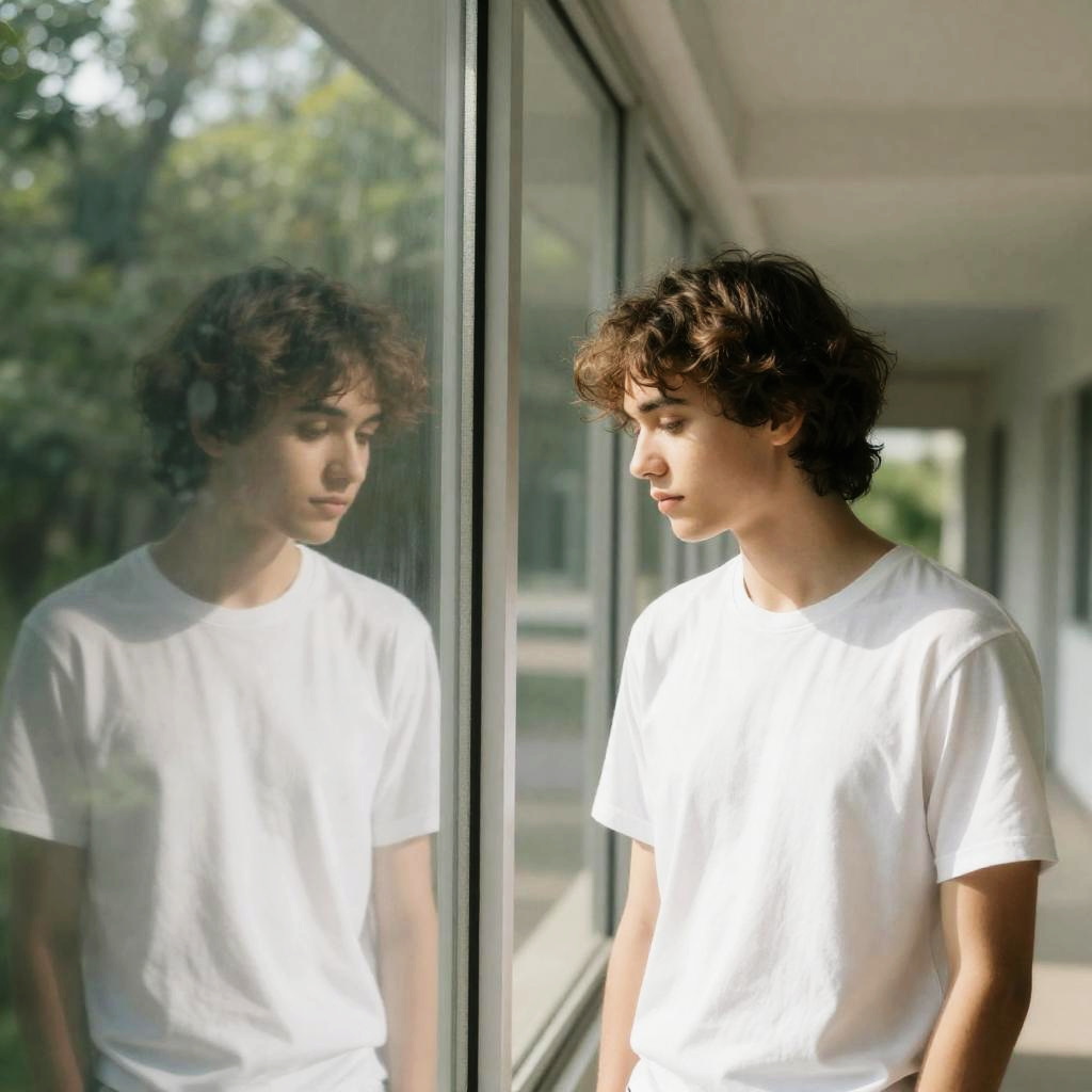 Young person with wavy brown hair, wearing a white t-shirt, stands by a large glass window, reflecting their profile. Sunlight filters through, illuminating the room and casting soft shadows. Greenery outside the window. Long corridor with white walls and ceiling in the background. Person looks down, expression neutral. Reflection in the glass shows mirrored profile.