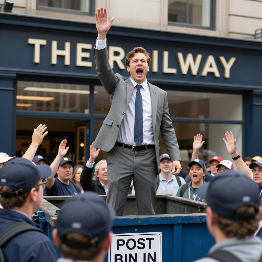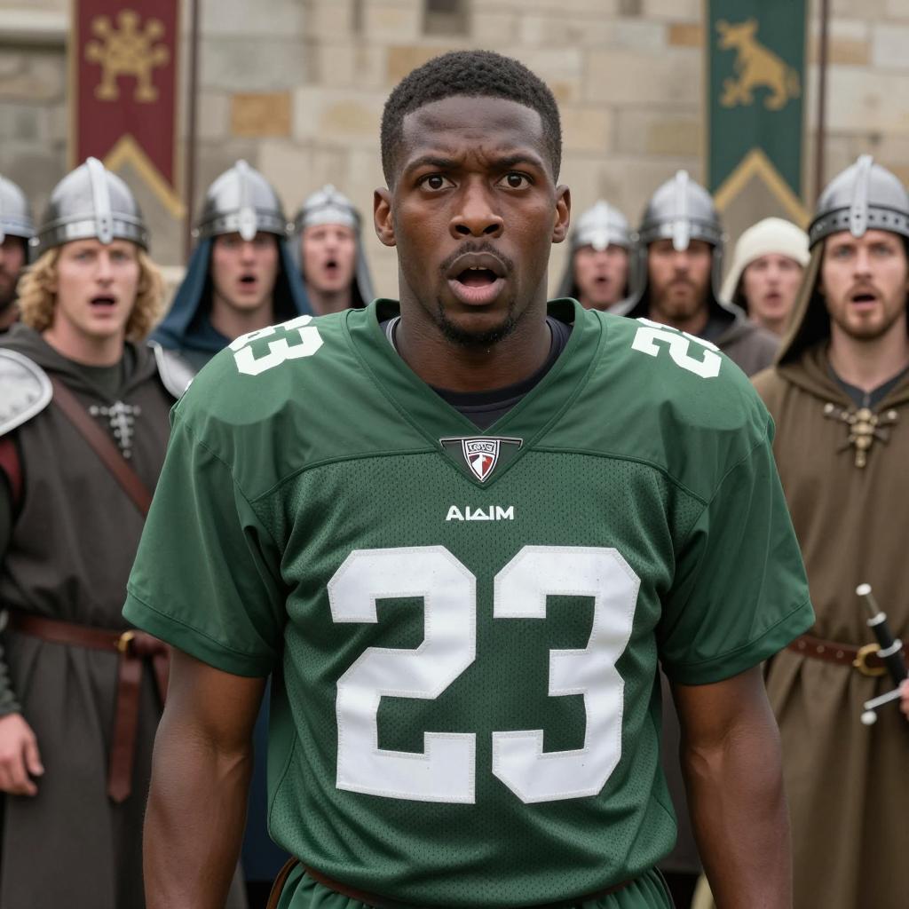Coach in dark suit and red shirt, yelling with clenched fist, stands in front of football players. Two players in black jerseys with white numbers 57 and 94, one wearing a hat, stand behind him. Four players in black jerseys with white numbers are in foreground, backs to camera. Red and orange background. Coach's intense expression, players' focused expressions. Three people in background, five in foreground.