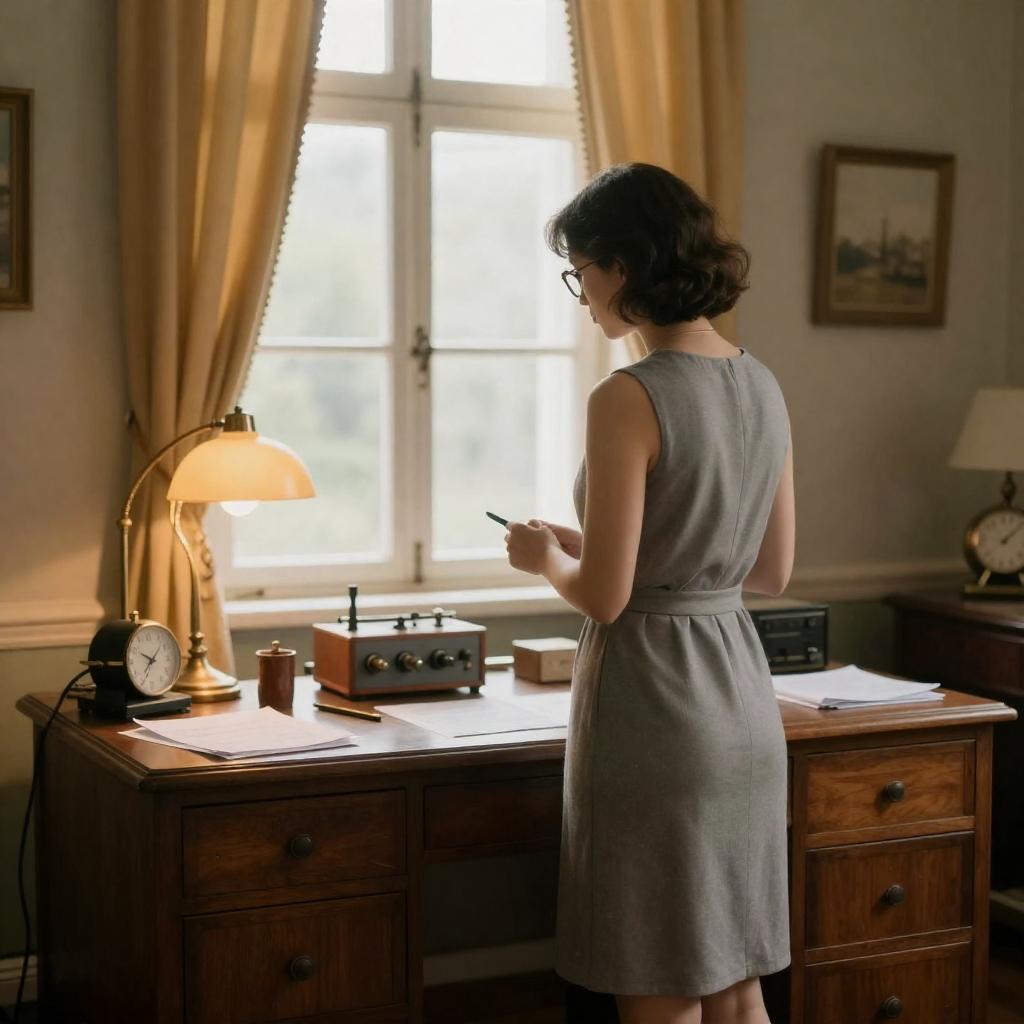 Woman in gray dress with dark hair and glasses stands in front of wooden desk in warmly lit room. Desk has various scientific instruments, papers, lamp, and clock. Large windows with yellow curtains in background. Light streams through windows, illuminating room. Woman's back to camera, holding pen. Room has vintage feel.