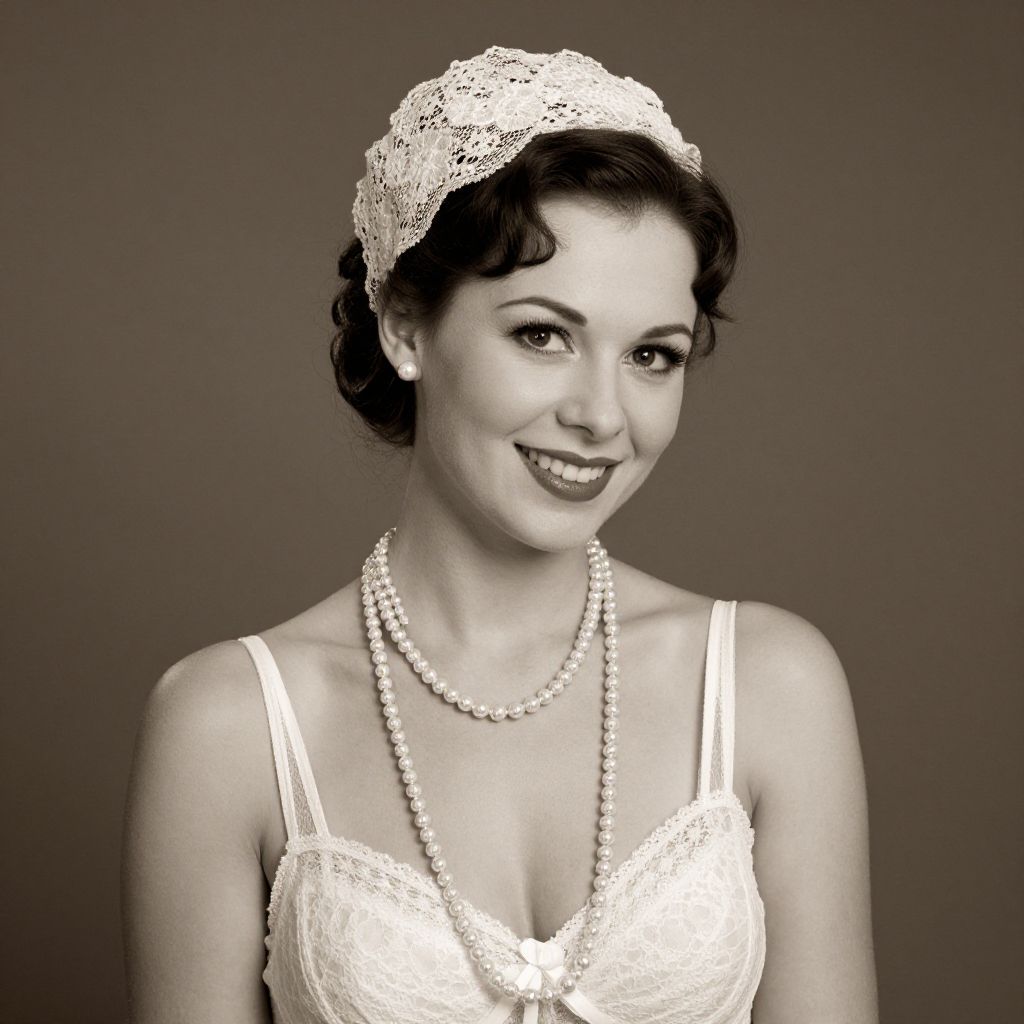 Elegant vintage portrait featuring a smiling woman adorned with a lace headpiece, pearl necklace, and delicate white lingerie, embodying the classic \"White Lady\" aesthetic in a sepia-toned composition.