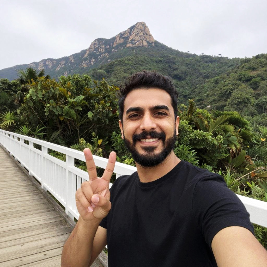 Photograph of a smiling man with dark hair and beard, wearing a black t-shirt, standing on a wooden bridge with white railings. He's making a peace sign with his right hand. Behind him, there's a lush green forest and a mountain with rocky peaks under a bright, overcast sky. The man is taking a selfie.