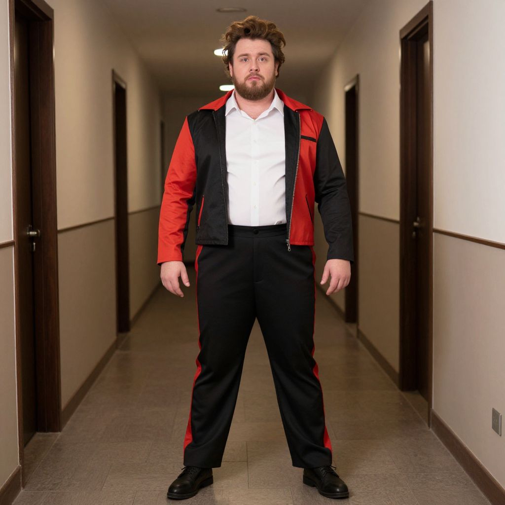 Photograph of a Caucasian man with wavy brown hair and a beard, standing in a long, empty hallway with beige walls and dark wooden trim. He wears a white dress shirt, black pants, and a red and black jacket. His expression is serious, and his arms are relaxed by his sides. The hallway has a tiled floor and several closed doors on either side. The lighting is even, highlighting the man as the central focus. The image has a slight digital enhancement, giving it a slightly surreal, hyper-realistic appearance.