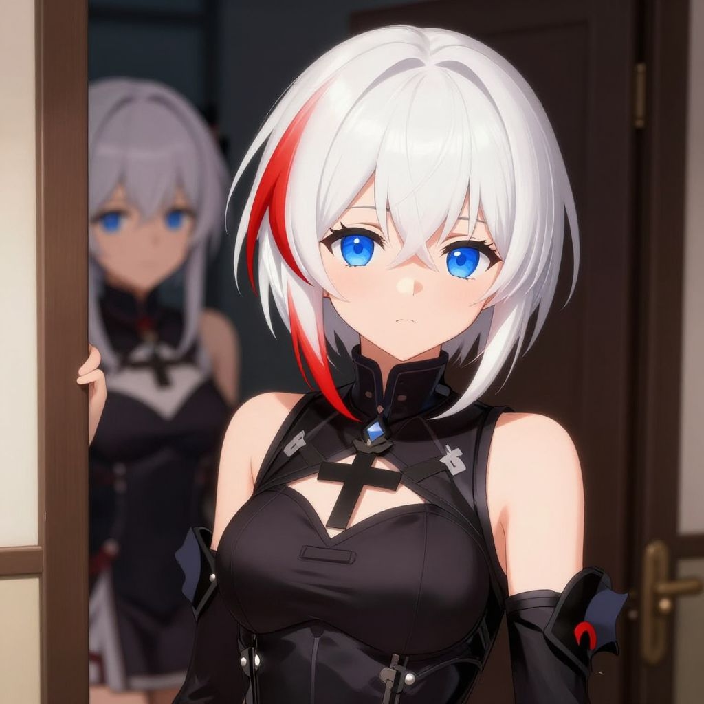 Digital anime-style drawing of a white-haired girl with blue eyes, black outfit, and red streak, standing in a doorway, another blue-eyed girl in
