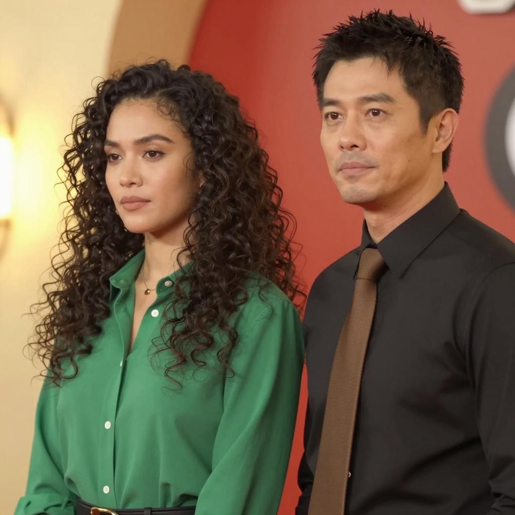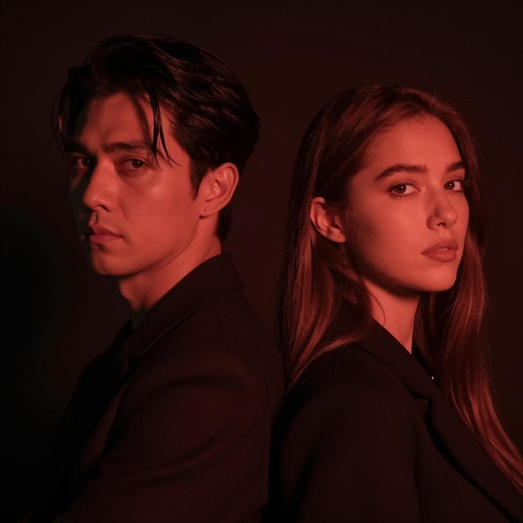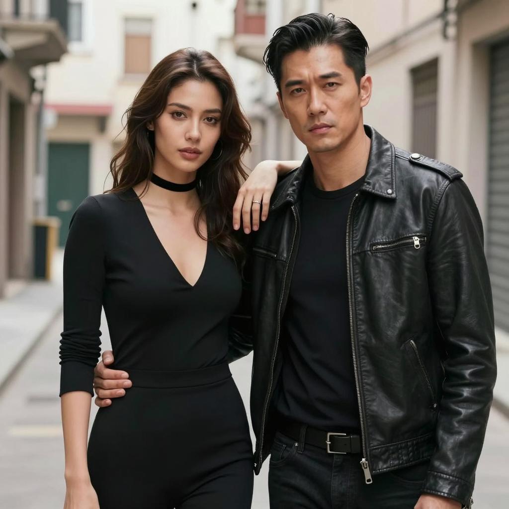 A man and woman standing closely in an urban alleyway. Woman with dark, wavy hair, wearing a black choker and deep V-neck black top, arm around man's shoulder. Man with dark, slicked-back hair, wearing black leather jacket and black shirt, neutral expression. Background includes blurred buildings and sunlight. Woman's left hand has a ring. Man's right arm is relaxed by his side. Both have intense expressions.