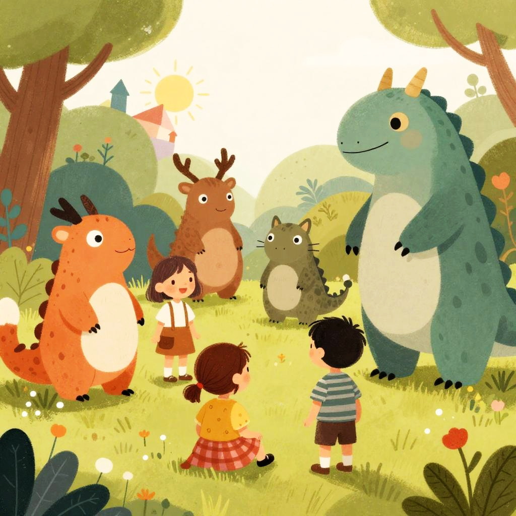 This digital illustration in a whimsical, cartoon style depicts a sunny, forest clearing with six children and five fantastical creatures. The children, with diverse skin tones and hair colors, wear simple, colorful clothes. A large, orange dinosaur with black spots stands to the left, while a green, blue-spiked dinosaur towers on the right. In the center, a small, brown, deer-like creature with antlers stands beside a gray, fluffy creature. The background features tall trees, a bright sun, and a distant village with red roofs. The ground is covered in yellow grass with scattered flowers and large leaves.