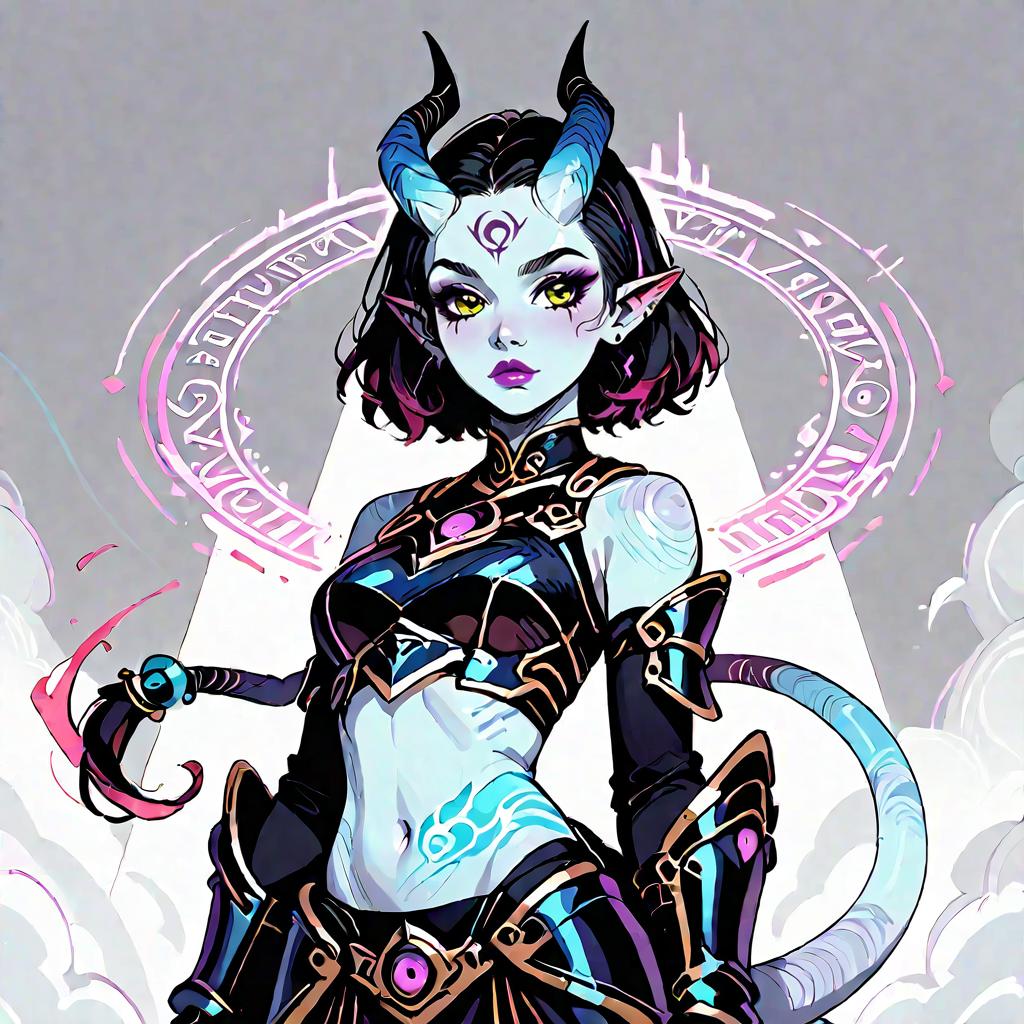 Score_9, score_8_up, score_7_up, source_anime 1girl, solo, horns, pointy ears, colored sclera, colored skin, tail, tail ornament, armor, smirk, midriff, navel, standing, magic circle, aura